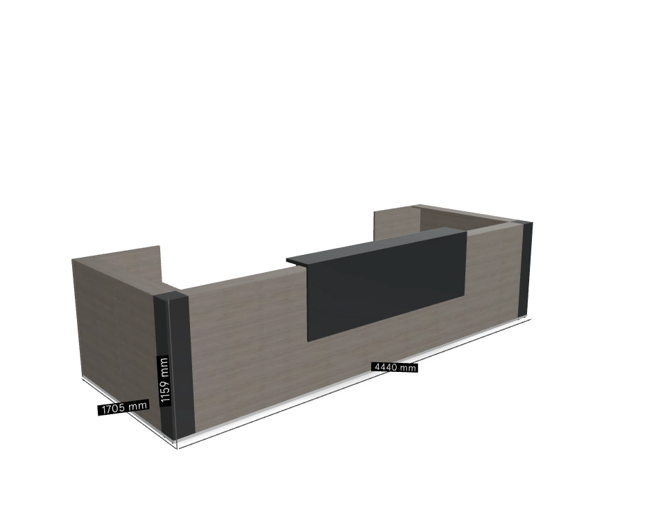 lada do recepcji TERA szer 4440 gł 1705 wys 1159 mm, w kolorze Dąb Szary z elementami Grafitowymi