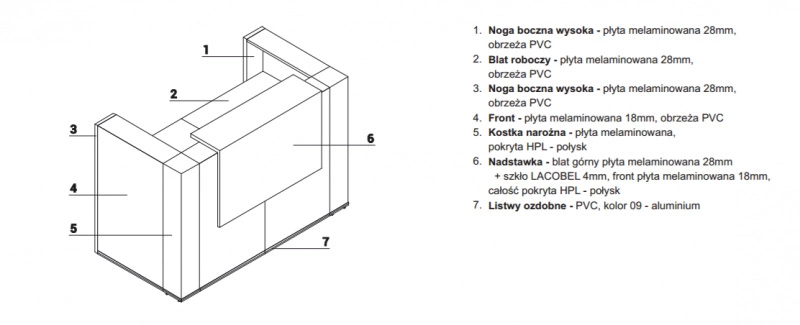 Bok łączący lady niskie i wysokie - płyta melaminowana 28 mm, obrzeża ABS 2 mm;