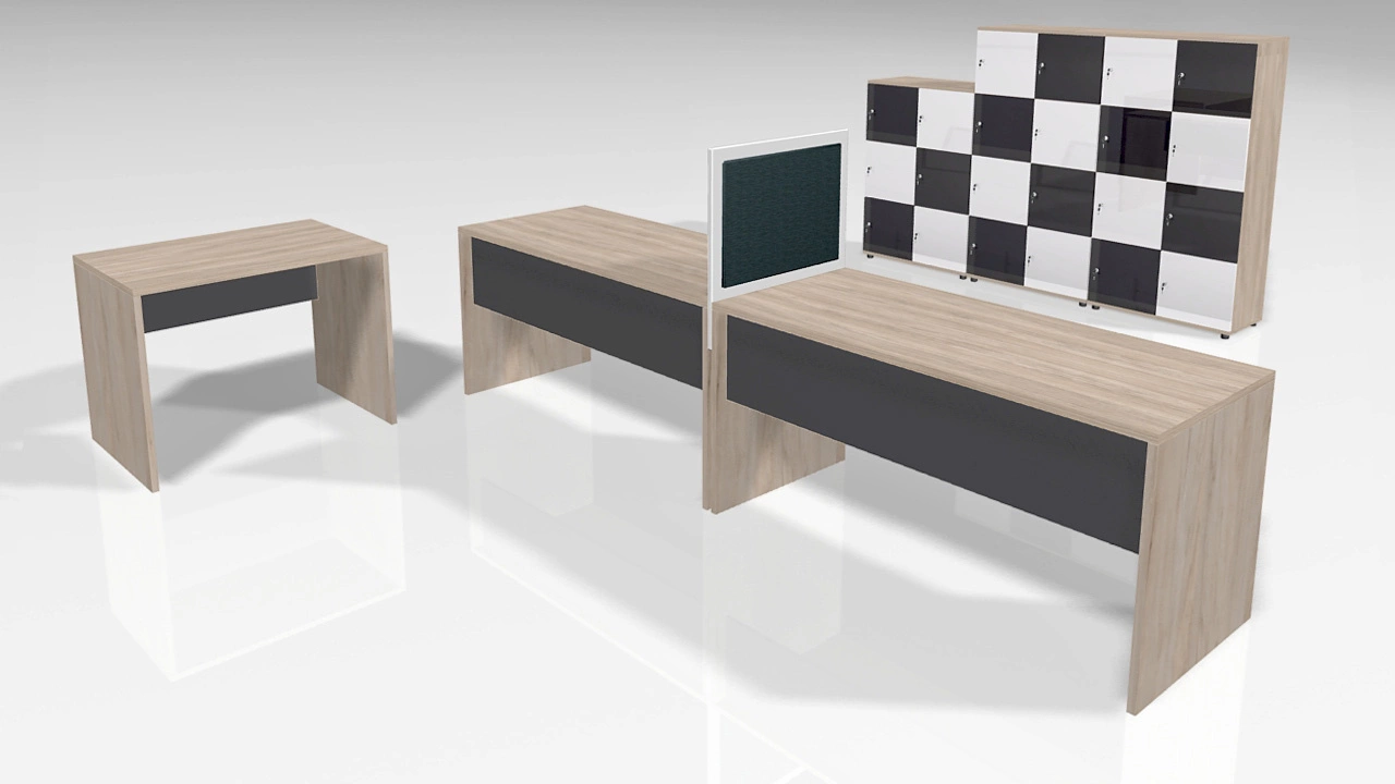 Cechą biurka jest brak nawisów bocznych oraz nawisów przód tył. Nogi i blat wykonany z płyty 25 mm, lotka 18 mm, blat obrzegowany okleiną 2 mm, nogi obrzegowane z 4 stron okleiną 2 mm.