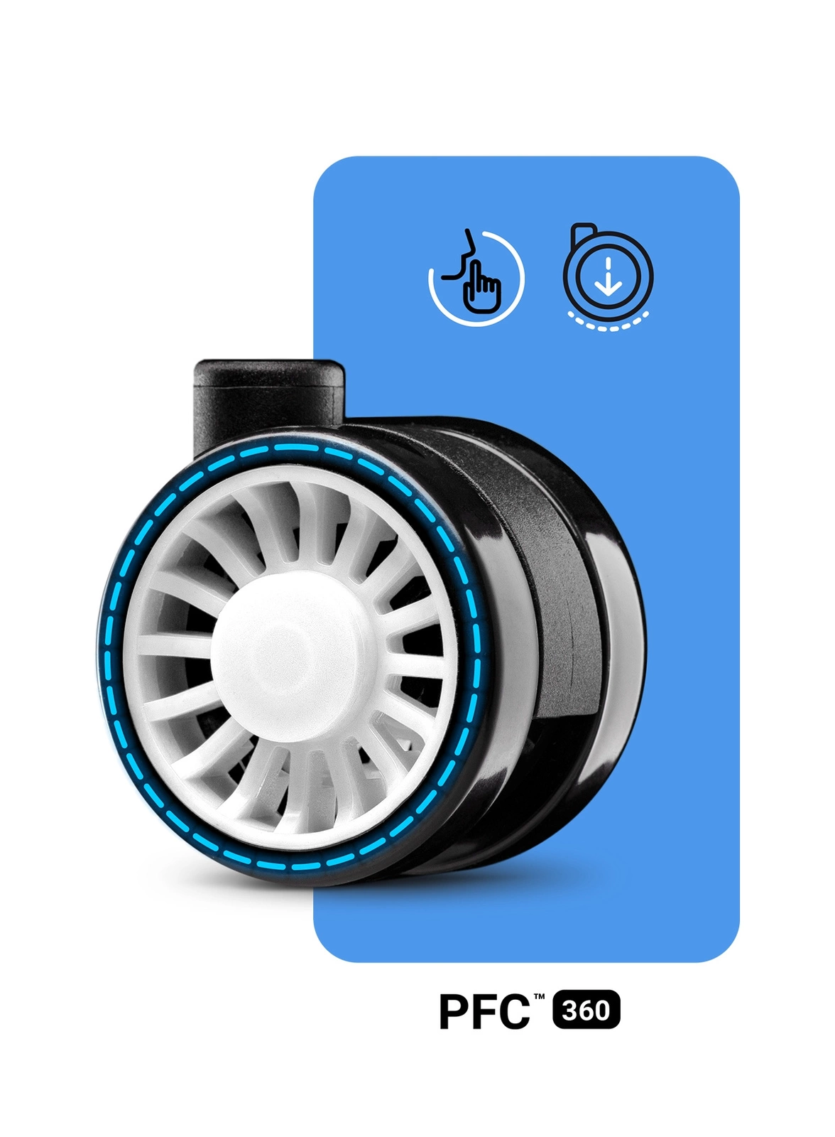 Wytrzymałe kółka PFC™360 będą płynnie toczyć się po każdej powierzchni, a ich kauczukowa powłoka zabezpieczy podłogę przed powstawaniem zarysowań.