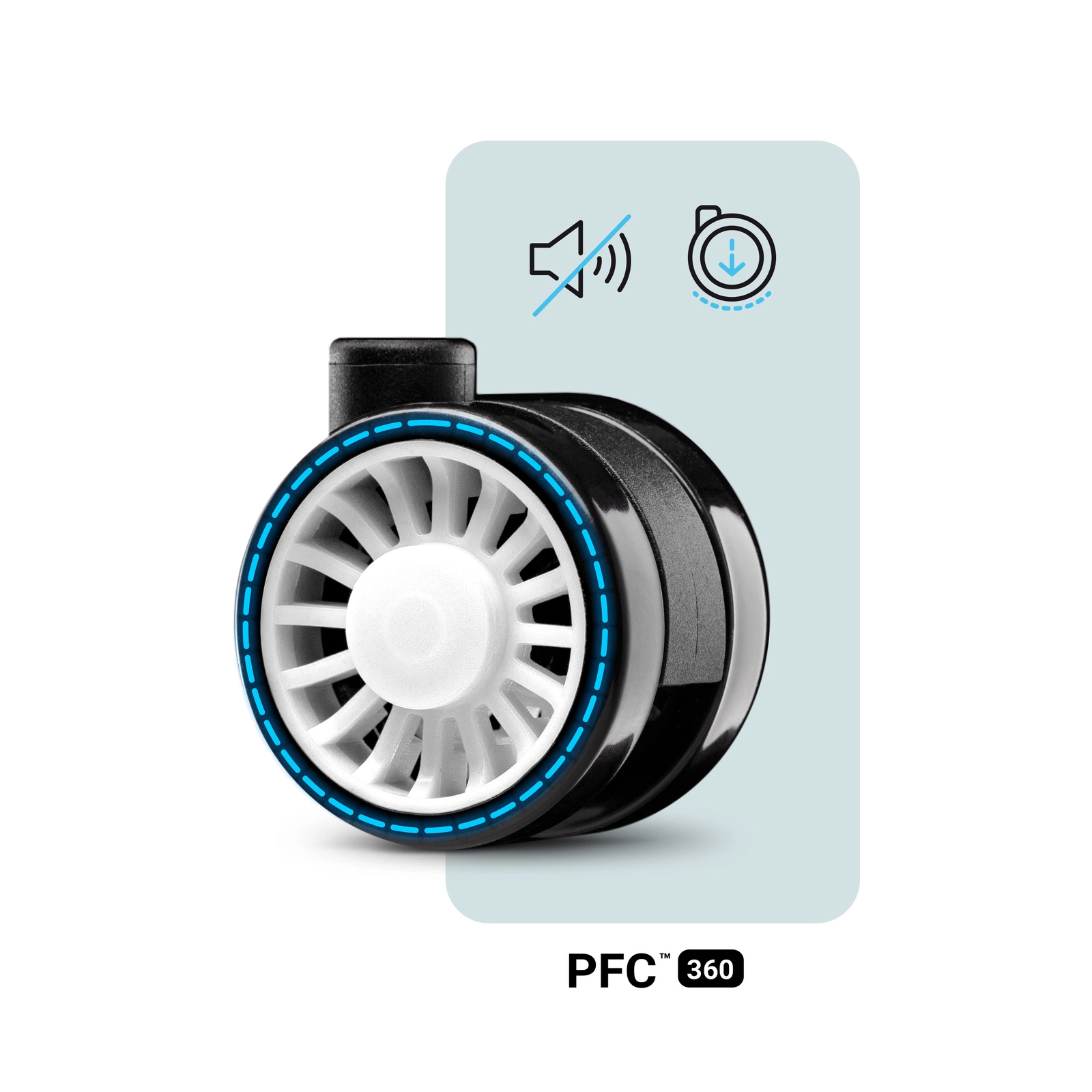 Kółka PFC™360 o średnicy 75 mm wyposażone zostały w nowoczesne felgi. Dzięki kauczukowej powłoce zabezpieczą podłogę przed powstaniem zarysowań.