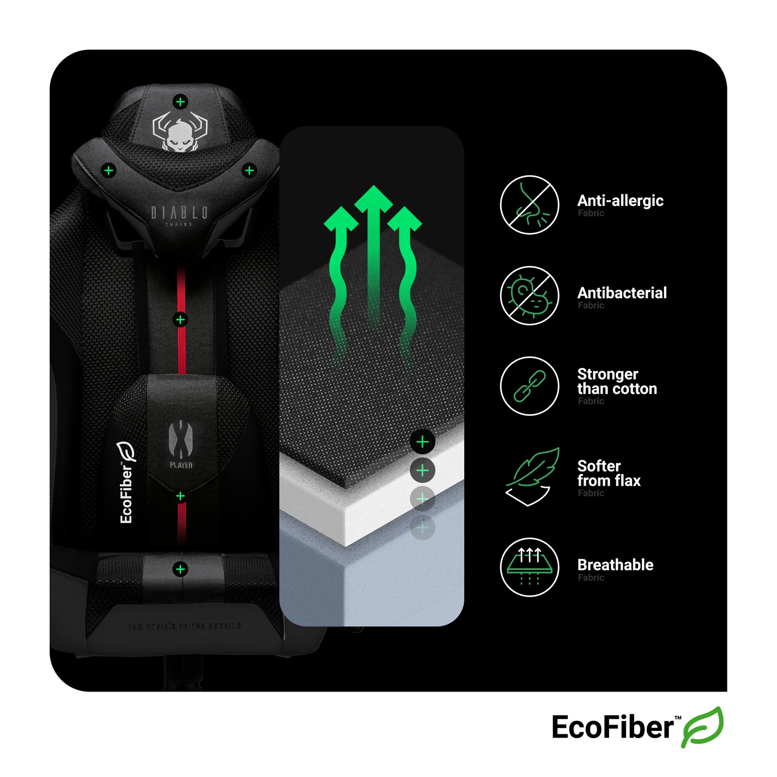 - Mocna tkanina EcoFiber™ oraz siateczka Diablo Honeycomb™ o oddychającej strukturze plastra miodu tworzą wyjątkowo przewiewną tapicerkę, która chroni sylwetkę przed przegrzaniem.
