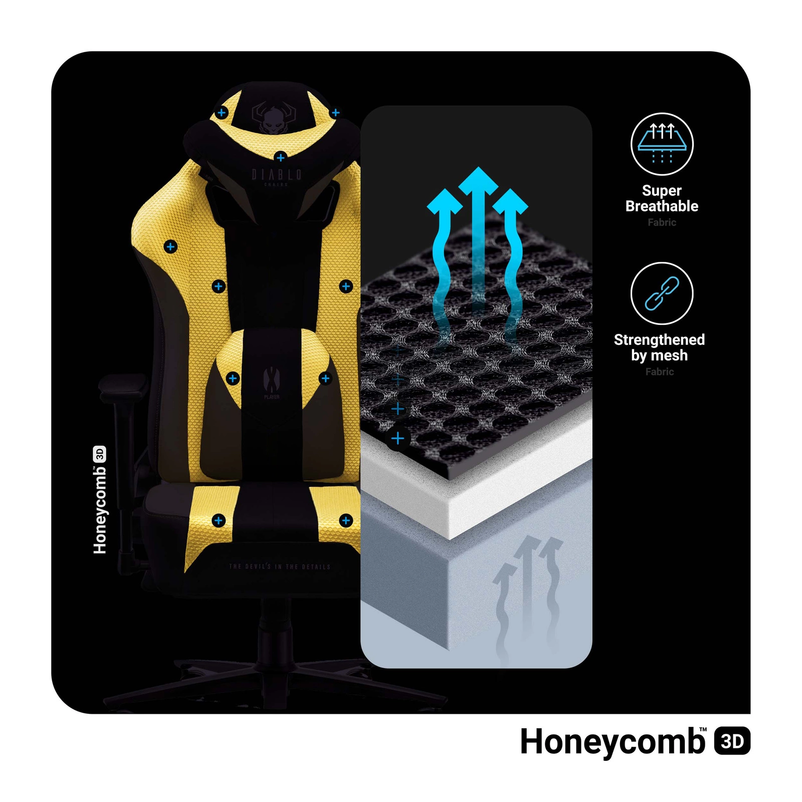 Nasz fotel gamingowy powstał z innowacyjnych materiałów, dzięki którym gwarantuje doskonałą cyrkulację powietrza. Wytrzymałe włókno EcoFiber™ oraz siateczka Diablo Honeycomb™ to tkaniny mocne i odporne na przetarcia.