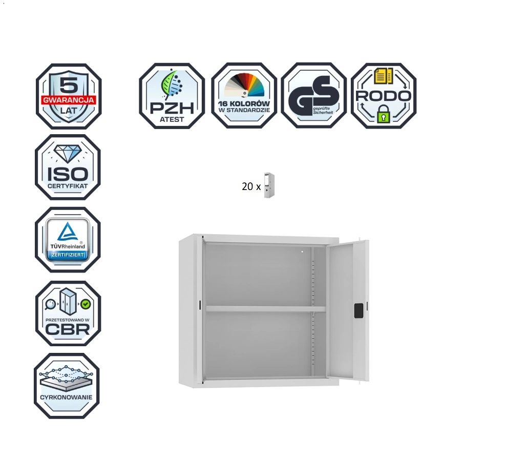 Nadstawka SBM 802 na szafę aktową – 800 mm. Pomieści 20 segregatorów, kolor : RAL 7035 – jasnoszary. Szafa zgodna z wytycznymi RODO.