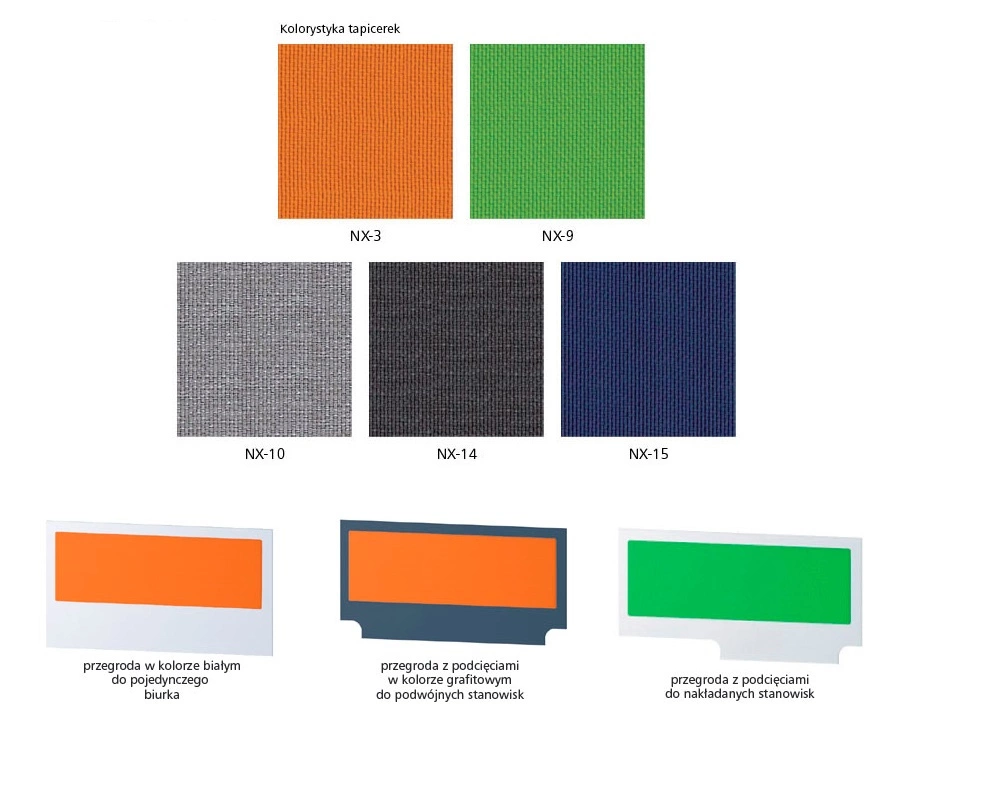 - Przegrody polecamy razem z biurkami dwustronnymi. Kolorowe tapicerki na przegrodach uczynią stanowisko pracy bardziej przyjaznym. Istnieje możliwość wyboru koloru tapicerki : pomarańczowy, granatowy, zielony, szary, grafitowy.
