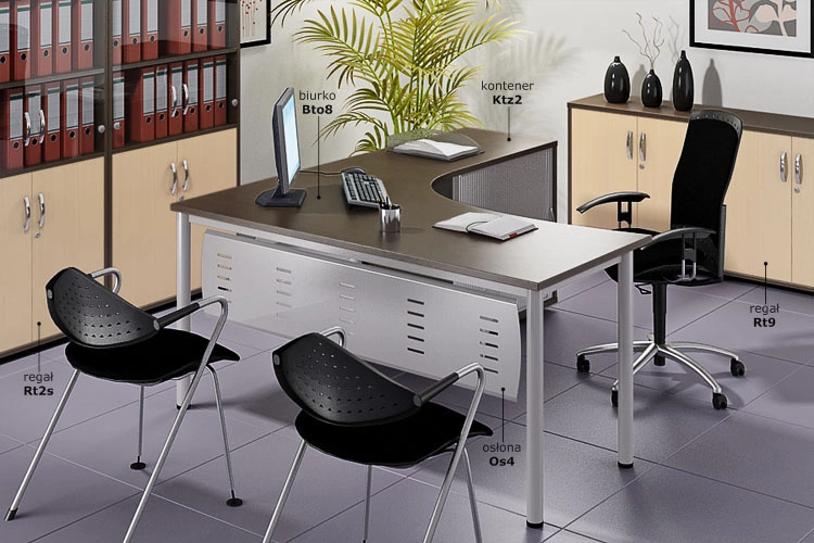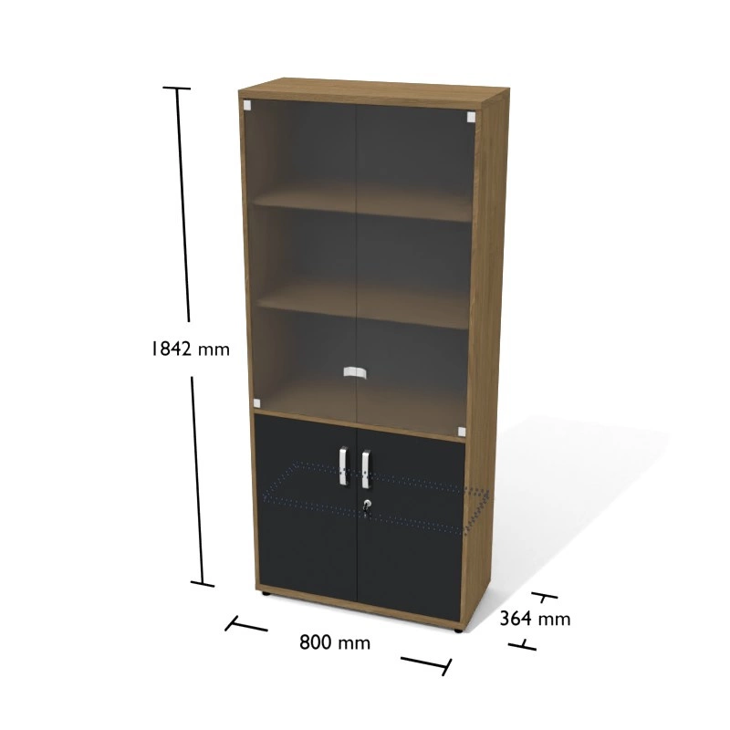 Regał wysoki (1842 mm), drzwi wpuszczane. Podzielony jest półkami na 5 przestrzeni (OH) o wysokości segregatora, dodatkowe nawierty umożliwiają zmianę wysokości każdej półki w 5 położeniach.