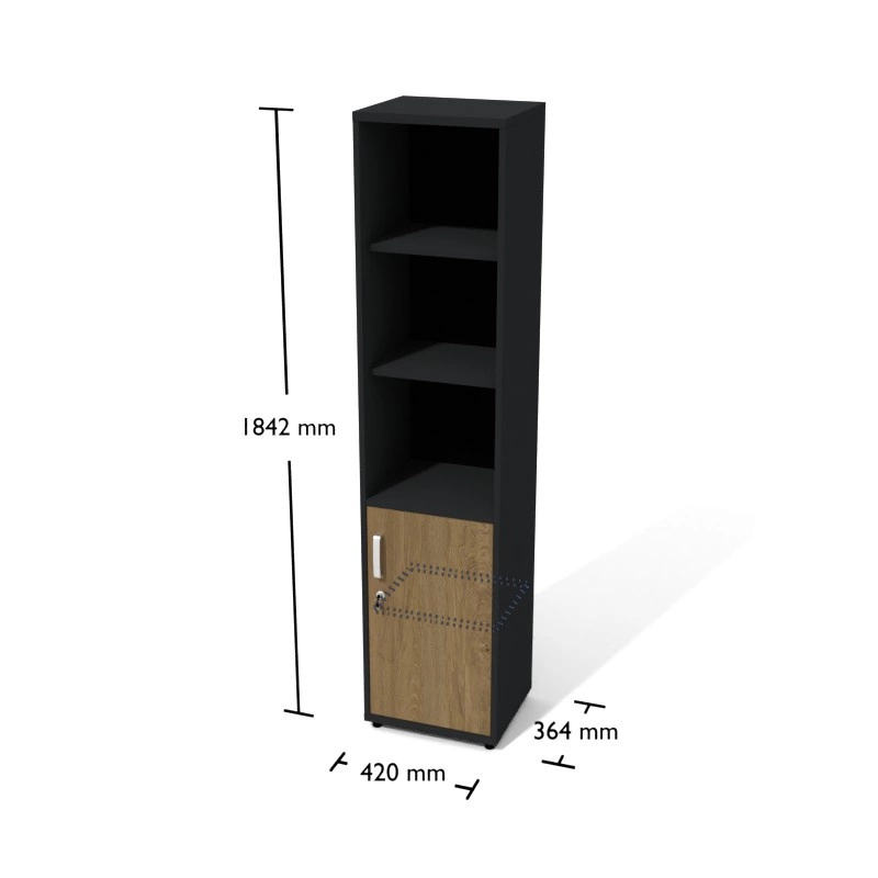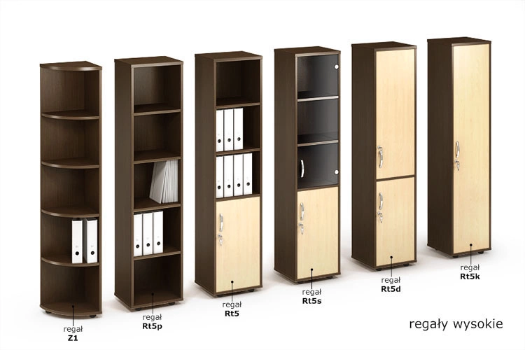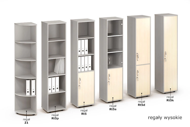Regał wysoki (1842 mm), wąski (420 mm), drzwi wpuszczane. Podzielony jest półkami na 5 przestrzeni (OH) o wysokości segregatora, dodatkowe nawierty umożliwiają zmianę wysokości każdej półki w 5 położeniach.