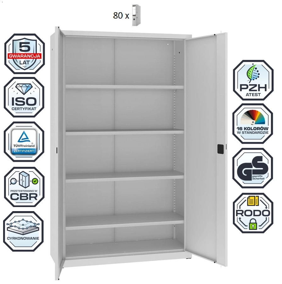 Szafa aktowa metalowa SBM 212 – 1200 mm. Szafa pomieści 80 segregatorów. Kolor : RAL 7035 – jasnoszary. Szafa zgodna z wytycznymi RODO.
