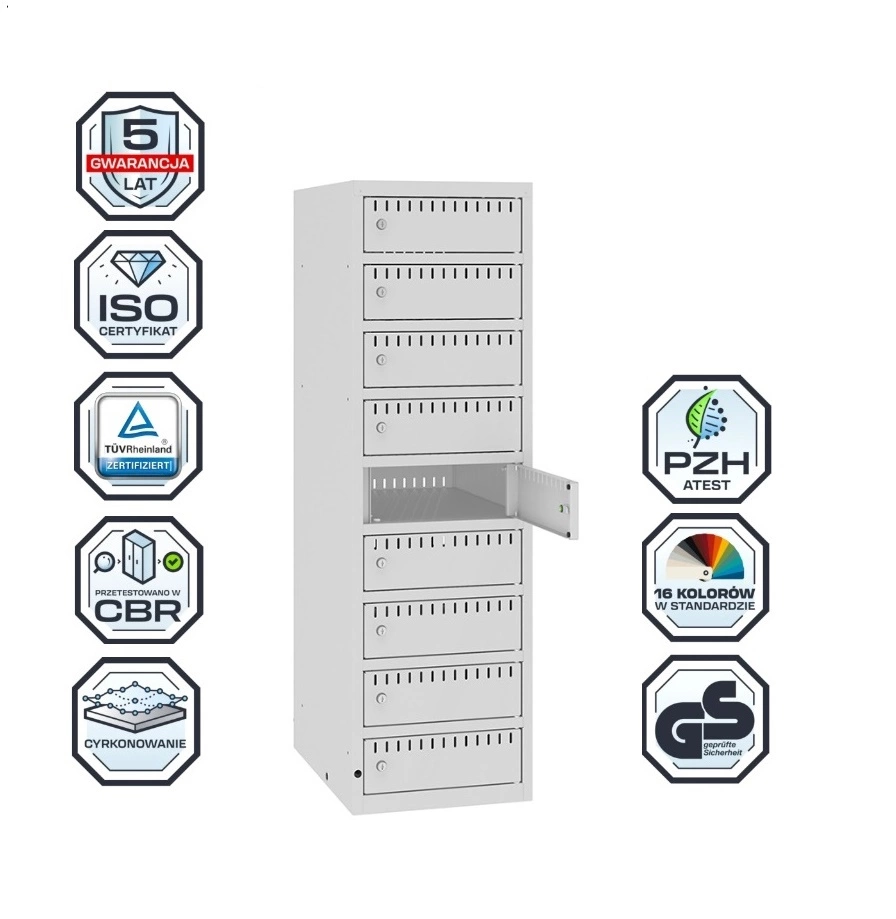 Szafa PCS M5109 - stojąca do ładowania akumulatorów rowerowych.stojąca: 9 skrytek trwała konstrukcja: korpus szafy wykonany z blachy o gr. 0,8 mm, drzwi z blachy o gr. 1,5 mm montaż do ściany za pomocą kołków rozporowych o wymiarze 12x60 mm każda skrytka o wymiarach 141x540x280 mm (wys. x szer. x gł.) wentylacja szafy za pomocą perforacji w drzwiach oraz w ścianach tylnych skrytek znajdujące się w skrytce gniazda o klasie szczelności IP44, 230V AC 16A zasilane są przewodem z wtykiem unischuco" (napięcie rzędu 100V nie występuje w krajach w wtykiem unischuco) maksymalna moc szafy 3680W szafa wyposażona w bezpiecznik nadprądowy w szafkach mogą być przechowywane dowolne akumulatory mieszczące się w skrytkach z wyjątkiem kwasowoołowiowych lub innych emitujących szkodliwe opary.