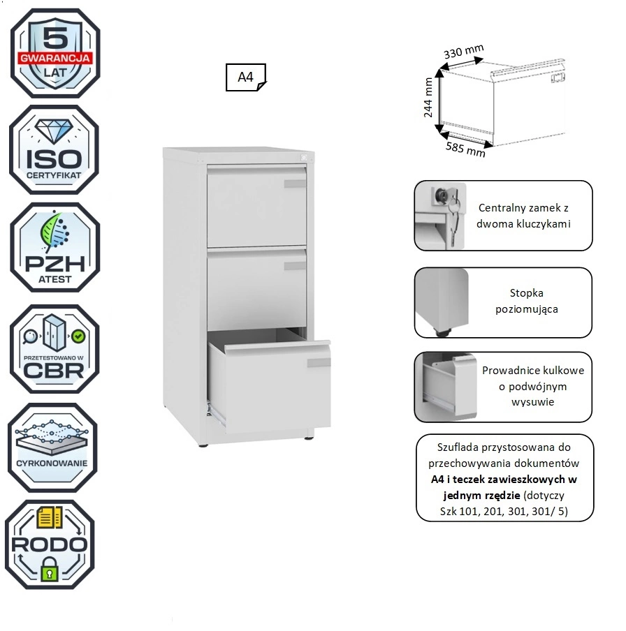 Szafki kartotekowe SZK do przechowywania dokumentów w formacie A4 i teczek zawieszkowych służą utrzymaniu porządku i łatwemu zarządzaniu dokumentami w formacie A4. Duży wybór wariantów pozwala precyzyjnie dopasować szafki do aktualnych potrzeb. Szafki Szk spełniają wymogi RODO. Są optymalnym wyborem do archiwum, recepcji, biura, gabinetu lekarskiego, gdzie występują formaty A4. Meble nie wymagają składania, dzięki czemu zyskują na wytrzymałości i stabilności. Wyposażone są w stopki poziomujące w zakresie 10 mm. Szuflada na prowadnicach kulkowych o podwójnym wysuwie i z zabezpieczeniem przed wypadaniem. Centralne ryglowanie szuflad Do szafek Szk dostępne są nadstawki.