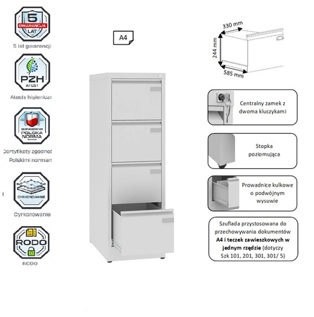 Szafki kartotekowe SZK do przechowywania dokumentów w formacie A4 i teczek zawieszkowych służą utrzymaniu porządku i łatwemu zarządzaniu dokumentami w formacie A4. Duży wybór wariantów pozwala precyzyjnie dopasować szafki do aktualnych potrzeb. Szafki Szk spełniają wymogi RODO. Są optymalnym wyborem do archiwum, recepcji, biura, gabinetu lekarskiego, gdzie występują formaty A4. Meble nie wymagają składania, dzięki czemu zyskują na wytrzymałości i stabilności. Wyposażone są w stopki poziomujące w zakresie 10 mm. Do szafek Szk dostępne są nadstawki.