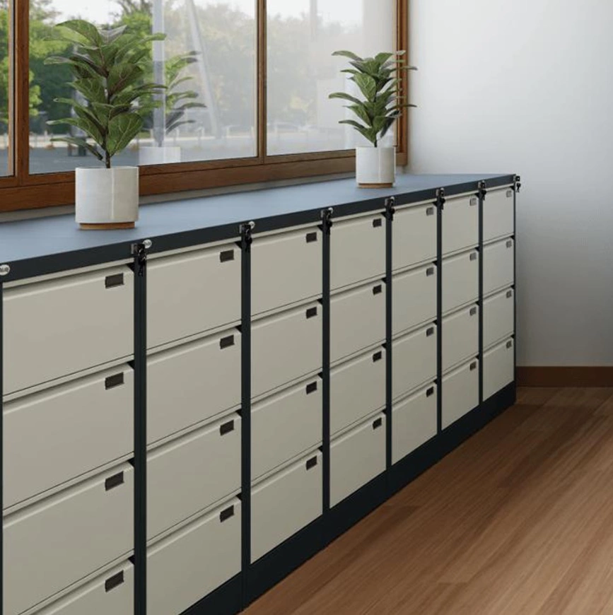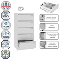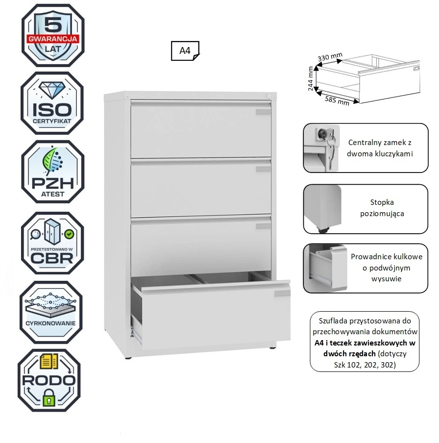 Szafki kartotekowe SZK do przechowywania dokumentów w formacie A4 i teczek zawieszkowych służą utrzymaniu porządku i łatwemu zarządzaniu dokumentami w formacie A4. Duży wybór wariantów pozwala precyzyjnie dopasować szafki do aktualnych potrzeb. Szafki Szk spełniają wymogi RODO. Są optymalnym wyborem do archiwum, recepcji, biura, gabinetu lekarskiego, gdzie występują formaty A4. Meble nie wymagają składania, dzięki czemu zyskują na wytrzymałości i stabilności. Wyposażone są w stopki poziomujące w zakresie 10 mm. Szuflada na prowadnicach kulkowych o podwójnym wysuwie i z zabezpieczeniem przed wypadaniem. Centralne ryglowanie szuflad Do szafek Szk dostępne są nadstawki.