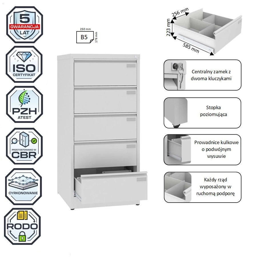 Szafki kartotekowe z serii Szk 318 służą do przechowywania dokumentów w formacie B5. Szuflady są podzielone na dwa rzędy, co pozwala do maksimum wykorzystać dostępną przestrzeń. Każdy z rzędów standardowo wyposażony jest w podpórkę do dokumentów (po 2 podpórki na szufladę), co umożliwia utrzymanie porządku w szufladzie. Szafki Szk spełniają wymogi RODO. Są optymalnym wyborem do gabinetów lekarskich, biur, recepcji, gdzie występują formaty B5. Meble nie wymagają składania, dzięki czemu zyskują na wytrzymałości i stabilności. Wyposażone są w stopki poziomujące w zakresie 10 mm. Szuflada na prowadnicach kulkowych o podwójnym wysuwie i z zabezpieczeniem przed wypadaniem. Do szafek Szk dostępne są nadstawki.