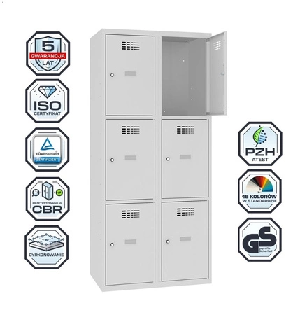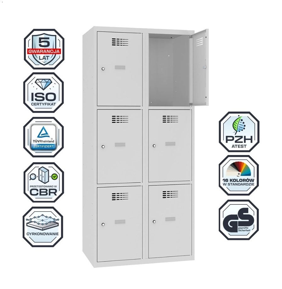 Metalowa szafa ubraniowa sześcio-skrytkowa Sus 423W wyposażona jest w samoprzylepny szyldzik oraz otwory wentylacyjne zwiększające cyrkulację powietrza. Solidna konstrukcja szaf umożliwia ustawienie ich na nóżkach, cokole, podstawie z siedziskiem i półką na buty oraz zamontowanie daszka. Szafy SumW produkcji MALOW znajdują zastosowanie w każdej szatni pracowniczej, szkolnej oraz w siłowniach. Nie wymagają składania, dzięki czemu zyskują na wytrzymałości i stabilności.