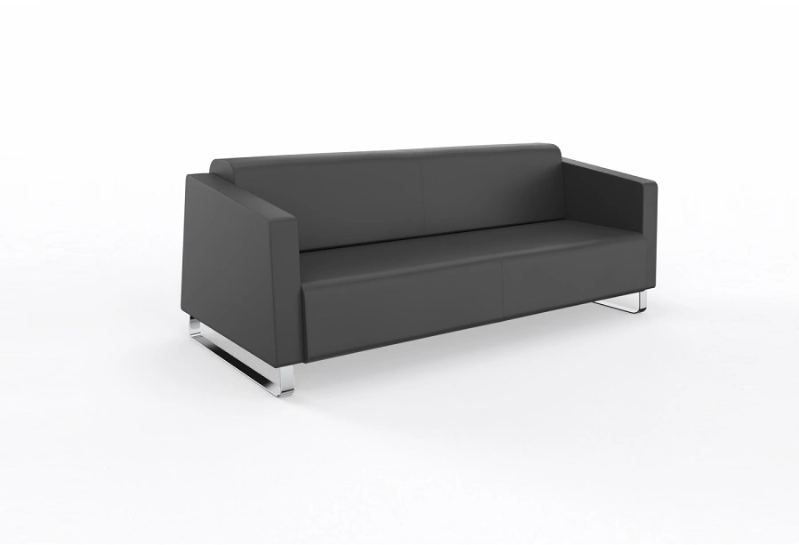 Dzięki zastosowaniu tego materiału sofa jest łatwa w czyszczeniu i prezentuje efektownie. Podstawa sofy na na płozach wykonana jest z chromowanej stali, co zapewnia elegancki